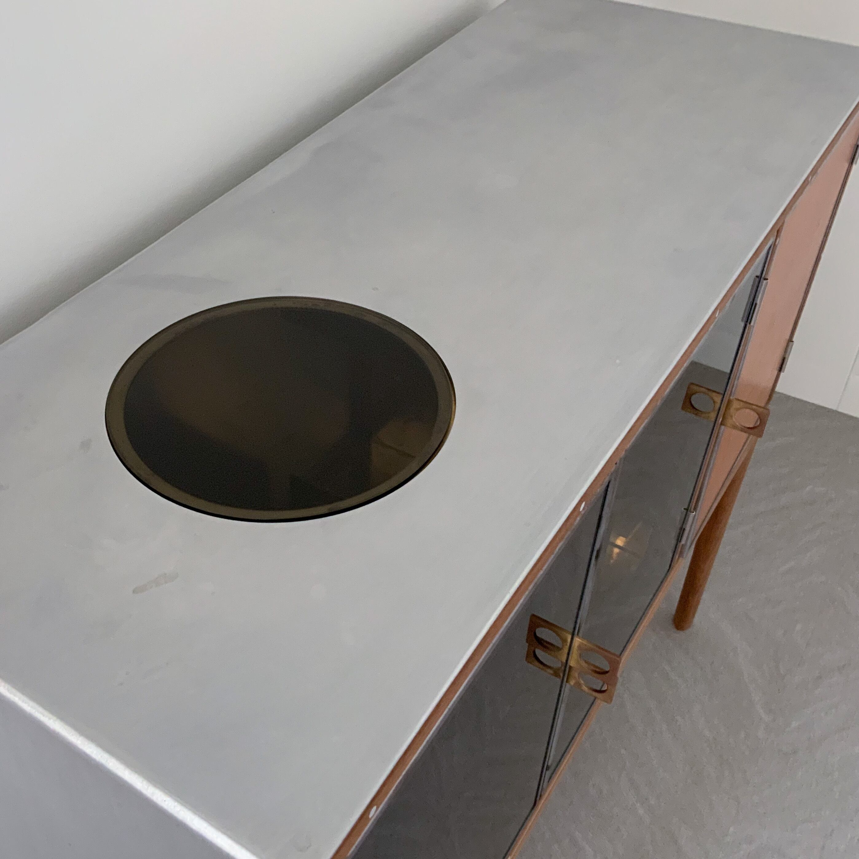 天面にグレーガラスの窓があり、正面はグレーガラス扉とナチュラルレザー張り扉。